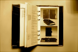 I saw a prototype of the PersonalPOD while I was in London in April, and it is very nice. The cover is hard-backed, and has a faux-cloth textured finish. "Dodo Pad" is subtly embossed on the front. Inside both the front and back covers are pockets for holding papers, tickets etc. An elastic strap holds the binder securely closed.