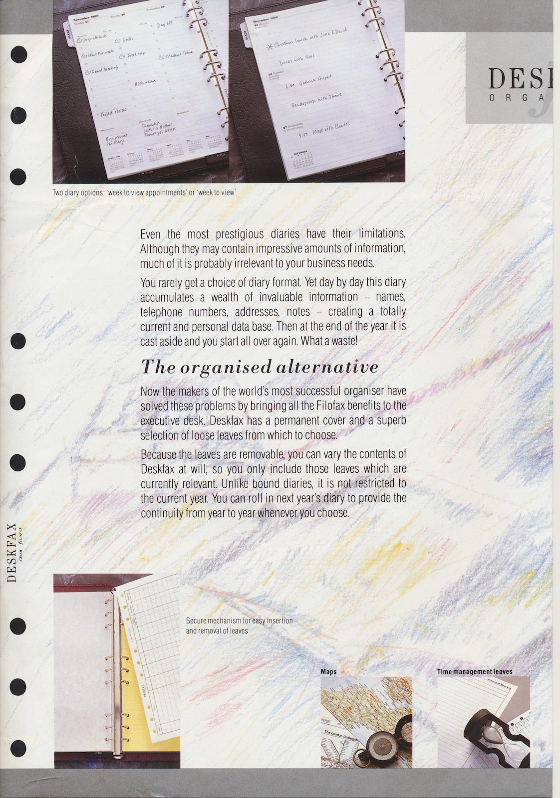 This brochure dates from about 1989 and compares the Filofax Deskfax with the Filofax Personal models.